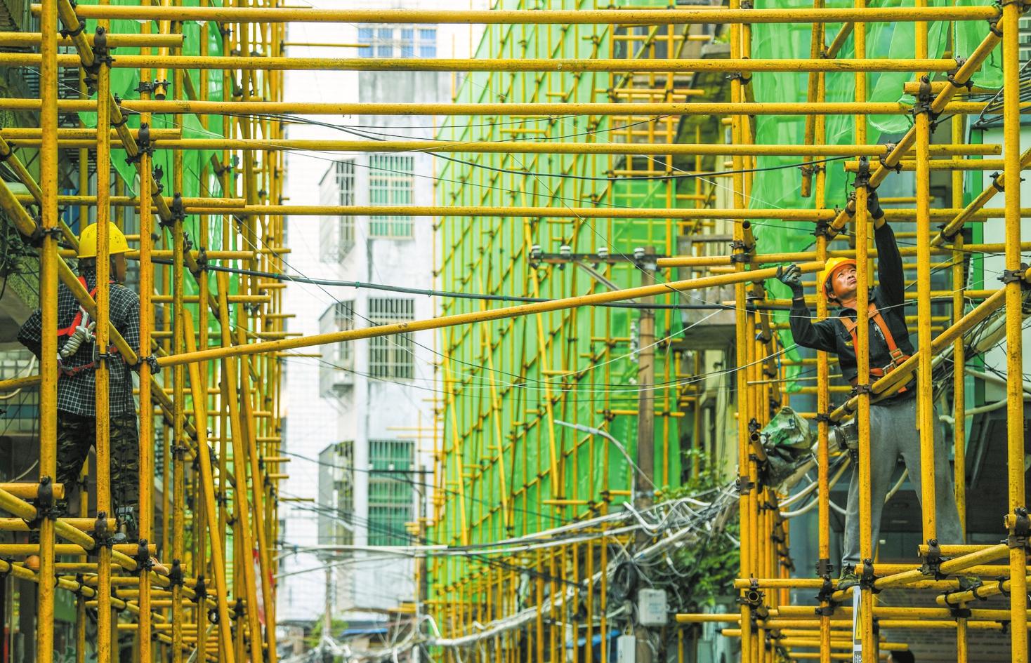 日前,在海口騎樓歷史文化街區(qū)少史巷內(nèi),施工人員在搭建腳手架。記者 康登淋 攝