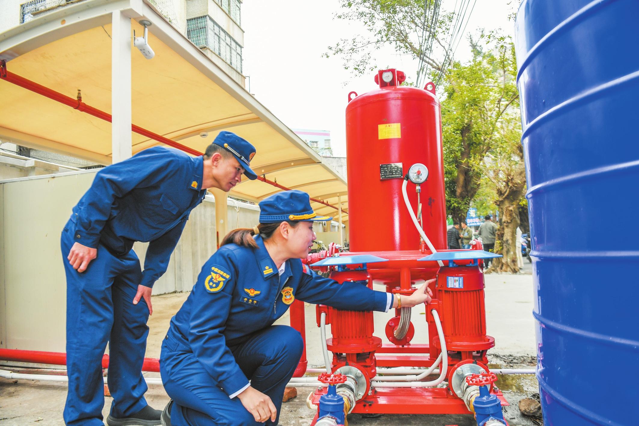 在??谑旋埲A區(qū)秀英村社區(qū),消防人員正在檢查新建電動(dòng)自行車棚的自動(dòng)滅火裝置。記者 康登淋 攝