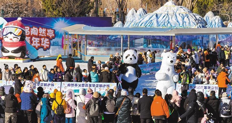 1月6日,北京第十五屆陶然亭冰雪嘉年華,游客在戲雪樂園參與人偶互動表演。記者 劉月楊 攝