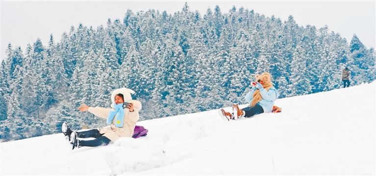 1月9日,重慶市酉陽土家族苗族自治縣菖蒲草原景區(qū)銀裝素裹,游客在雪地運動。陳碧生 攝(中經(jīng)視覺)
