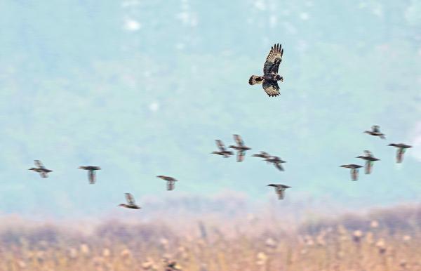 2024年12月15日,岳陽市屈原管理區(qū)營田鎮(zhèn),國家二級(jí)保護(hù)動(dòng)物白腹鷂在空中巡視,一群綠翅鴨從它腳下快速飛過。