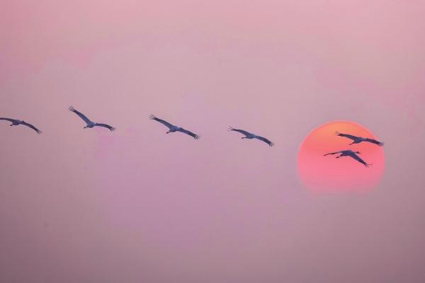 1月8日,臨湘市黃蓋湖,國家一級(jí)保護(hù)動(dòng)物白鶴穿日而過。白鶴全球數(shù)量6000多只,繁殖于西伯利亞,長江中游是其最重要的越冬地。