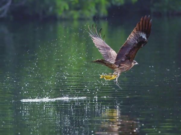 1月27日,長沙市雨花區(qū)跳馬鎮(zhèn),國家二級(jí)保護(hù)動(dòng)物黑鳶在空中盤旋,發(fā)現(xiàn)魚浮出水面,迅速俯沖將其捕獲,然后帶到安全的地方享用。