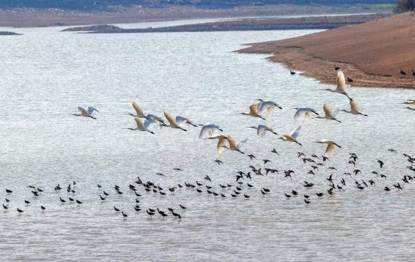 1月25日,岳陽縣麻塘垸,國家二級(jí)保護(hù)動(dòng)物白琵鷺從一群鶴鷸上方翩然飛過。