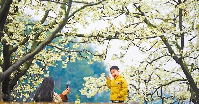 2月15日,廣西賀州市蓮塘鎮(zhèn)美儀村,市民游客在賞花拍照。黃旭胡 攝(中經(jīng)視覺)