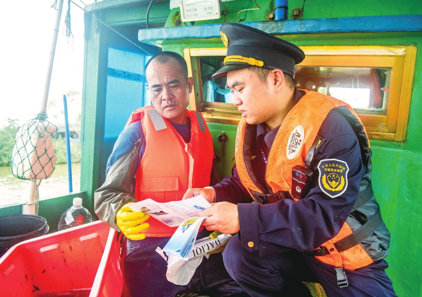 向漁民發(fā)放宣傳資料。