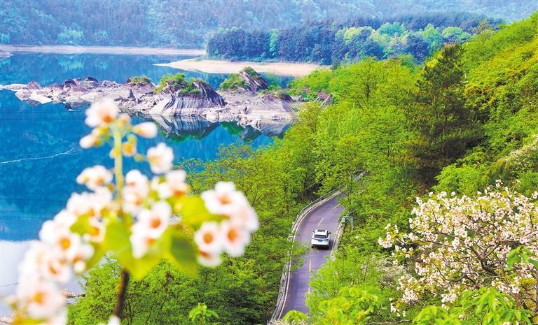 4月17日,車輛行駛在重慶市黔江區(qū)小南海鎮(zhèn)桐花掩映的繞湖公路上。楊敏攝(中經(jīng)視覺(jué))