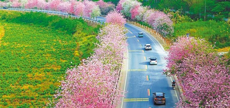 4月13日,廣西梧州市蒙山縣蒙山鎮(zhèn)北樓村公路兩旁的紫荊花競(jìng)相綻放。吳廣升攝(中經(jīng)視覺(jué))