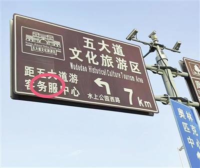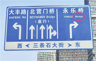 英文拼寫和翻譯的問題在天津市一些道路指示牌上也屢見不鮮。河?xùn)|區(qū)八緯路與北十五經(jīng)路交口,一塊地面立桿式道路指示牌上,“大直沽西路”的英文“west(西)”錯(cuò)誤標(biāo)為“east(東)”;紅橋區(qū)河北大街永樂橋橋下的指示牌,將“Bridge(橋)”錯(cuò)拼成“Beidge”;紅橋區(qū)西沽公園門口的一塊指示牌,將“丁字沽南大街輔路”英文翻譯成“Dingzigu South Auxlllary Rd”,誤拼的“Auxlllary”讓人難以理解。“我猜想,可能是要用‘Auxiliary(輔助的)’這個(gè)單詞。”河北工業(yè)大學(xué)的一位學(xué)生說。