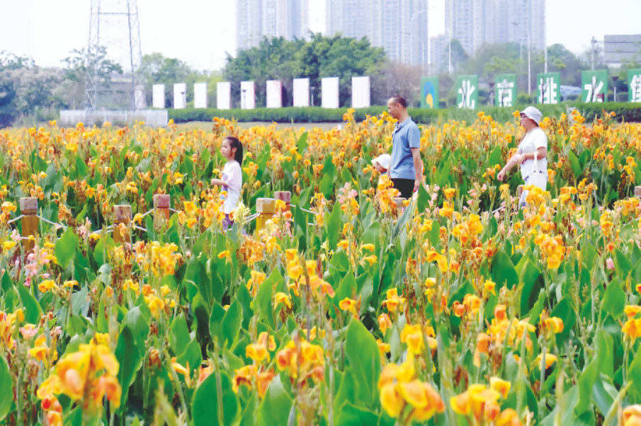 游客在那考河濕地公園美人蕉花海暢游。記者 宋延康 攝