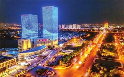 友誼南路夜色中的津典時代廣場(左)和蓮花酒店(右)如同璀璨的明珠