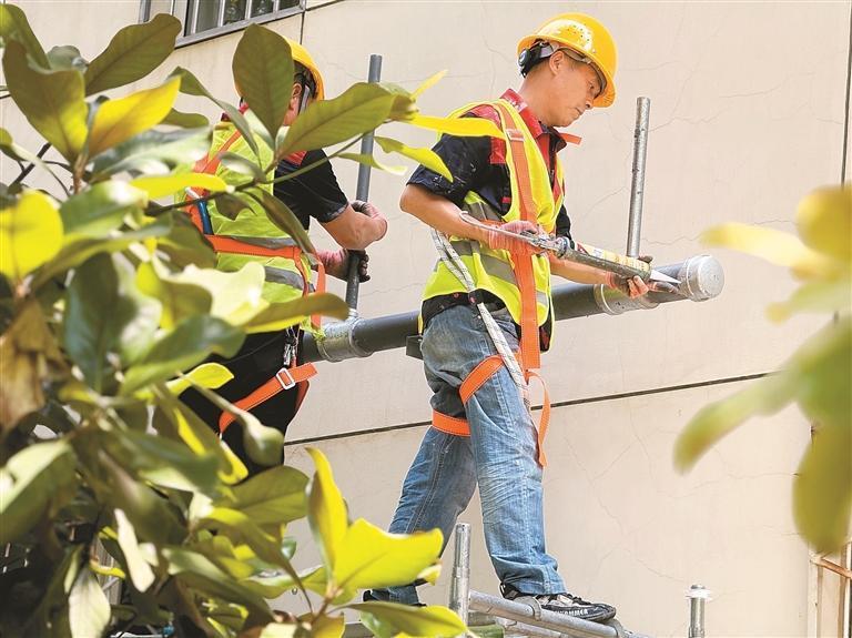 為盡可能減少施工對居民生活的影響,改造采用“微創(chuàng)手術式”作業(yè)。施工現(xiàn)場,一組工作人員正在備料場內(nèi)按尺寸切割管道,另一組工作人員已在腳手架上安裝新管道。