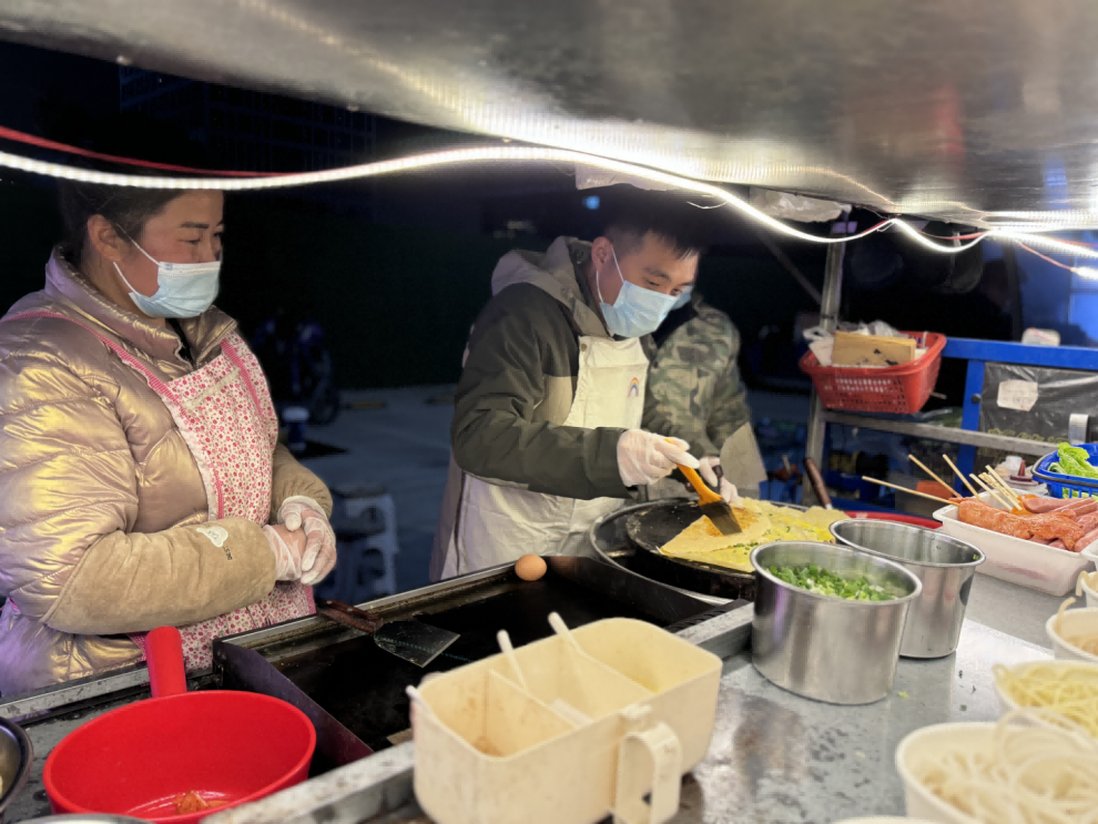 執(zhí)法人員便衣參與攤販經(jīng)營,跟隨攤主擺攤賣雜糧餅