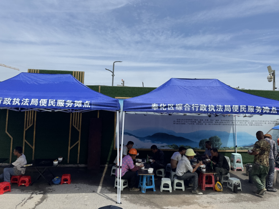 今年5月,奉化區(qū)藝術(shù)基地項目施工現(xiàn)場如火如荼,但數(shù)百名工人的就餐需求,催生出周邊流動攤販聚集、環(huán)境臟亂差的現(xiàn)象。執(zhí)法人員沒有簡單粗暴地取締,而是主動對接工地管理方,在工地圍擋外安全區(qū)域開辟出一片便民服務(wù)點,統(tǒng)一搭建了遮陽避雨的藍色棚頂,設(shè)置了簡易整潔的桌椅,引入4家攤販供餐。工人有了干凈衛(wèi)生的就餐環(huán)境,攤主告別了爭搶地盤、污水遍地的窘境,經(jīng)營更加規(guī)范。