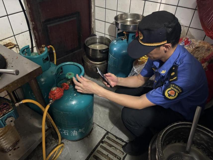 圖為執(zhí)法人員對餐飲店燃氣瓶進行掃碼檢查