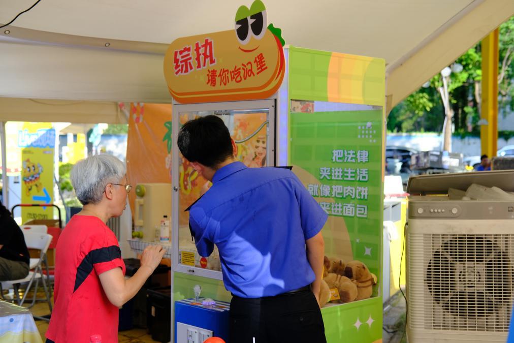 作為城市潮流地標(biāo),集盒廣場(chǎng)在青年群體中樹立了獨(dú)特的“潮工作、玩生活”品牌形象。因此,屬地東勝中隊(duì)在開展普法宣傳過(guò)程中,兼顧街區(qū)運(yùn)營(yíng)主體與商戶核心訴求、青年群眾體驗(yàn)需求與價(jià)值認(rèn)同,積極借助集盒廣場(chǎng)舉辦寧波咖啡生活周、漢堡節(jié)、暑期夜市等大規(guī)模集市期間的青年群體集聚效應(yīng),深挖街區(qū)文化地標(biāo)與潮流IP潛力,在果殼箱、綠化帶、共享單車停放點(diǎn)等顯著位置上設(shè)置綜合執(zhí)法Q版形象普法牌,以“一句話”形式生動(dòng)傳遞法律知識(shí)、引導(dǎo)文明行為。同時(shí),創(chuàng)新推出“綜執(zhí)請(qǐng)你吃漢堡”等主題攤位,精心設(shè)計(jì)“知識(shí)問答+潮玩互動(dòng)+獎(jiǎng)品兌換”的普法鏈條,參與者通過(guò)挑戰(zhàn)法律知識(shí)問答,贏取娃娃機(jī)游戲幣來(lái)抓取捆綁著漢堡兌換券的幸運(yùn)玩偶,再在漢堡節(jié)上進(jìn)行任意兌換。這種將嚴(yán)肅法律條文轉(zhuǎn)化為趣味挑戰(zhàn)的“游戲化”普法模式,顛覆了傳統(tǒng)的單向宣傳方式,通過(guò)互動(dòng)性與獲得感的雙重驅(qū)動(dòng),讓法律知識(shí)在歡聲笑語(yǔ)中沁入人心。