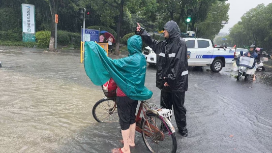江北區(qū)綜合行政執(zhí)法局在臺(tái)風(fēng)登陸前,爭(zhēng)分奪秒強(qiáng)化風(fēng)險(xiǎn)排查。執(zhí)法人員方璐在老外灘街區(qū)巡查時(shí),敏銳發(fā)現(xiàn)某酒吧將幾摞未使用的瓦片堆放在屋頂,存在重大安全隱患?!澳銈冓s緊找人把這些瓦片拿下來(lái)!”她立即與負(fù)責(zé)人溝通,明確告知違法風(fēng)險(xiǎn),現(xiàn)場(chǎng)監(jiān)督清理,及時(shí)消除了一處“頭頂上的隱患”。同時(shí),該局組織力量對(duì)戶外廣告、在建工地圍擋、道路下穿等關(guān)鍵部位進(jìn)行高頻次巡查,提前在江安路、康橋南路下穿、通寧路、洪塘西路等易積水路段設(shè)置警示樁和警戒線。莊橋中隊(duì)指導(dǎo)員江維海在積水中連續(xù)站立一小時(shí),逆著風(fēng)雨,一邊攙扶市民安全通過(guò),一邊大聲提醒過(guò)往車輛注意水深、謹(jǐn)慎慢行,嗓子喊啞了也顧不上休息。