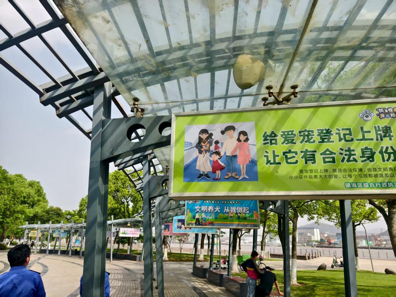 招寶山街道沿江公園的步道邊,是今年新增設的文明養(yǎng)犬宣傳長廊,金屬展板上用簡單的漫畫和標語提醒市民們文明養(yǎng)犬的注意事項。旁邊的寵物便袋箱里面裝著一卷卷可降解清理袋,供遛狗的居民隨時取用。