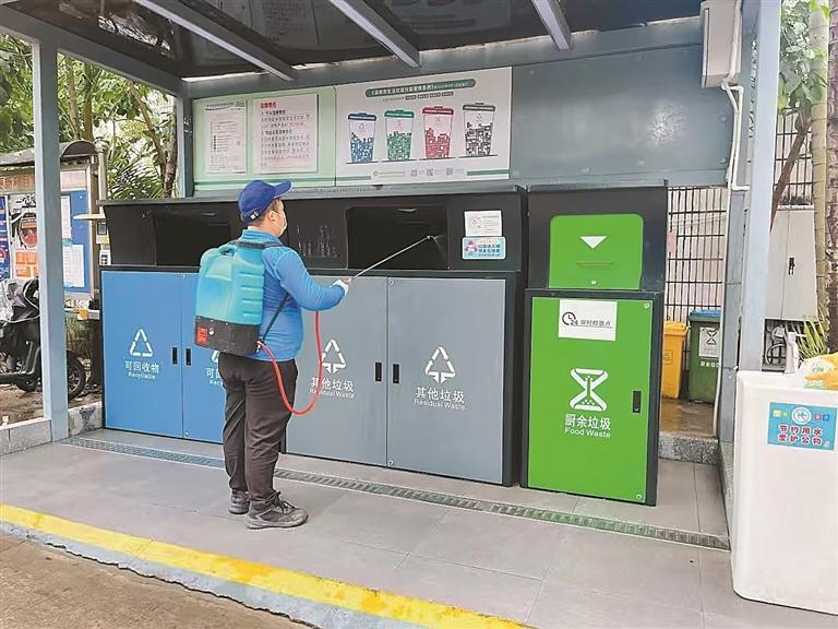 環(huán)衛(wèi)工人對垃圾分類投放點進(jìn)行消殺。