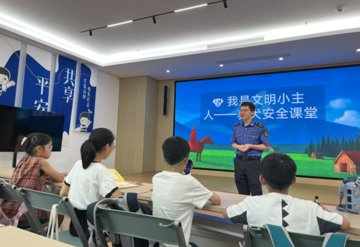活動中,執(zhí)法人員許平波化身普法“螢火蟲”,借助動畫PPT《我是文明小主人——養(yǎng)犬安全課堂》吸引孩子們的注意力,初步了解文明養(yǎng)犬相關(guān)的法律知識。隨后,他結(jié)合真實案例,用互動問答的方式,詳細(xì)講解了城市禁養(yǎng)犬類型、犬鏈規(guī)范使用、排泄物及時清理等法規(guī)知識,特別強(qiáng)調(diào)“一犬一牌”“大型犬戴嘴套”“電梯主動避讓”等日常場景的行為準(zhǔn)則。現(xiàn)場搶答環(huán)節(jié)熱烈,孩子們踴躍參與,在一問一答中進(jìn)一步筑牢了“依法養(yǎng)犬、責(zé)任養(yǎng)犬”理念。孩子們通過角色扮演、承諾簽名,逐漸從“聽懂”到“會做”,還主動爭當(dāng)“小小普法員”,表示要監(jiān)督家人文明養(yǎng)犬。