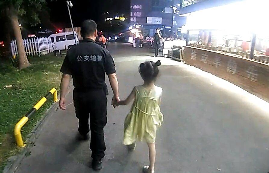 圖為輔警牽著孩子尋找小孩父母