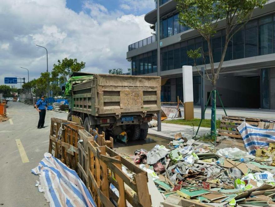 針對(duì)違規(guī)處置建筑垃圾行為,執(zhí)法人員開展定期巡查,強(qiáng)化運(yùn)輸監(jiān)管。7月,執(zhí)法人員巡查至鐵建·明賢府城市會(huì)客廳南側(cè)時(shí),發(fā)現(xiàn)一輛貨車正裝載著建筑垃圾行駛在道路上。因該型號(hào)貨車并不具備運(yùn)輸建筑垃圾的資格,執(zhí)法人員立即上前制止并引導(dǎo)司機(jī)至路邊詢問。經(jīng)詢問,貨車司機(jī)劉某某涉嫌個(gè)人違法從事建筑垃圾運(yùn)輸,該行為違反了《寧波市建筑垃圾管理?xiàng)l例》。