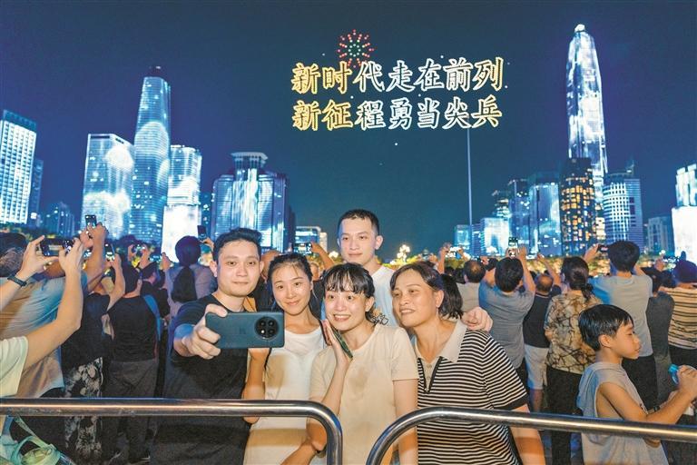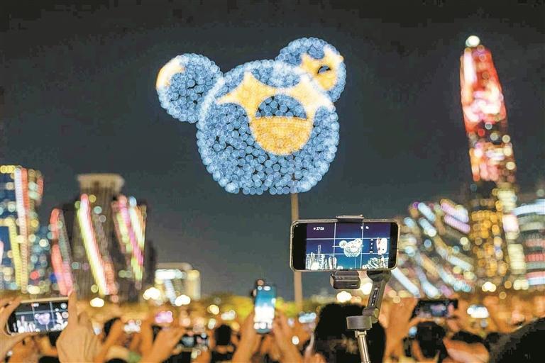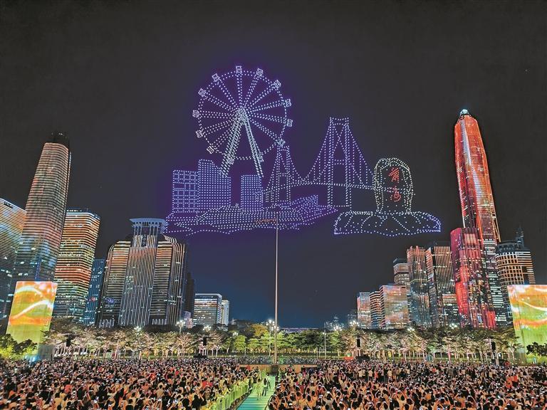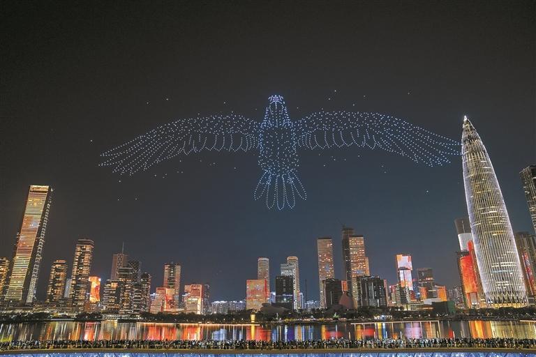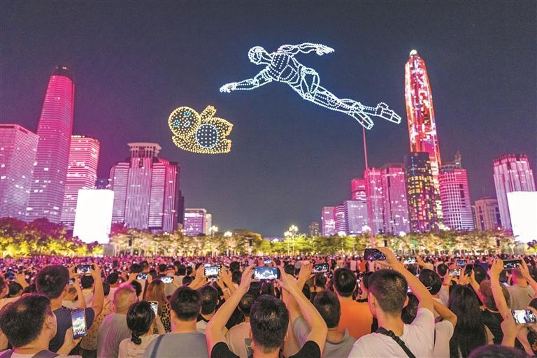 當(dāng)無人機陣列掠過夜空,地面建筑群也將隨之脈動。流光從云端灑向樓宇,色彩如呼吸般明滅變幻,天地連成一體。霓虹勾勒出特區(qū)發(fā)展長卷,光影流轉(zhuǎn)中浮現(xiàn)特區(qū)精神的時代符號——這是一座城市向自己的生日深情致敬。