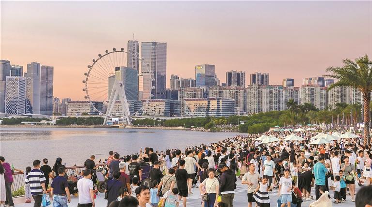 前海石公園人流如潮,市民游客拍照打卡“灣區(qū)之光”摩天輪和城市天際線,盡享假日濱海浪漫。