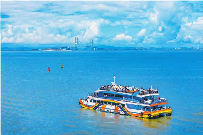 在伶仃洋中暢行的“海上彩虹號(hào)”觀光游船,游客沉浸式感受灣區(qū)魅力。