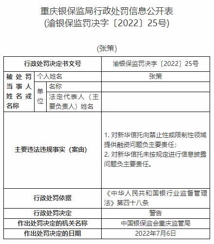張策對新華信托向禁止性或限制性領(lǐng)域提供融資問題負主要責(zé)任、對新華信托未按規(guī)定進行信息披露問題負主要責(zé)任。依據(jù)《中華人民共和國銀行業(yè)監(jiān)督管理法》第四十八條,中國銀保監(jiān)會重慶監(jiān)管局對其警告。