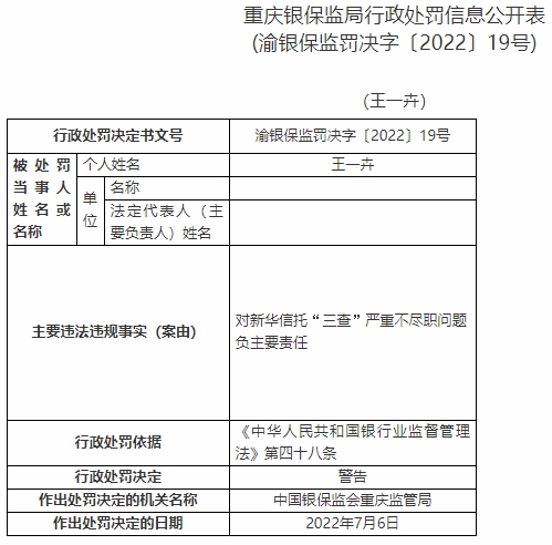 王一卉對新華信托“三查”嚴(yán)重不盡職問題負主要責(zé)任。依據(jù)《中華人民共和國銀行業(yè)監(jiān)督管理法》第四十八條,中國銀保監(jiān)會重慶監(jiān)管局對其警告。