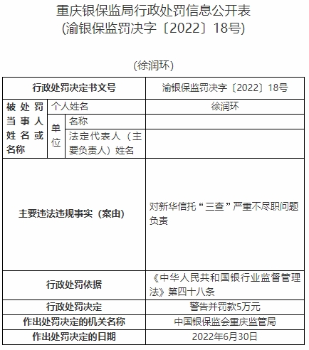 徐潤環(huán)對新華信托“三查”嚴(yán)重不盡職問題負責(zé)。依據(jù)《中華人民共和國銀行業(yè)監(jiān)督管理法》第四十八條,中國銀保監(jiān)會重慶監(jiān)管局對其警告并罰款5萬元。