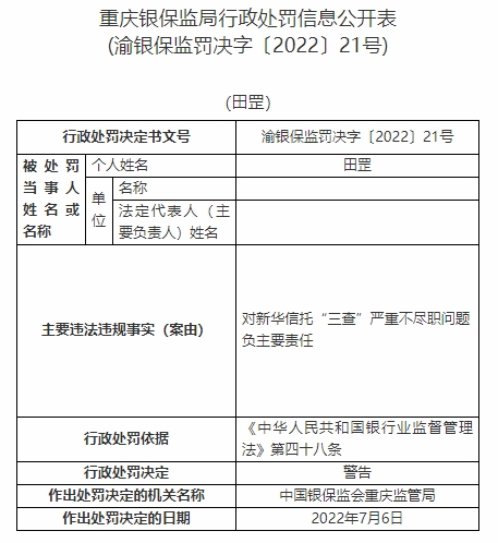 田罡對新華信托“三查”嚴(yán)重不盡職問題負主要責(zé)任。依據(jù)《中華人民共和國銀行業(yè)監(jiān)督管理法》第四十八條,中國銀保監(jiān)會重慶監(jiān)管局對其警告。
