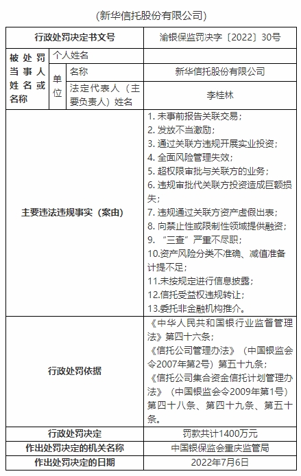 銀保監(jiān)會網(wǎng)站今日公布了重慶銀保監(jiān)局行政處罰信息公開表(渝銀保監(jiān)罰決字〔2022〕30號、16號、18號、19號、20號、21號、22號、23號、24號、25號、26號、27號、28號、29號、31號、32號)顯示,新華信托股份有限公司存在13宗主要違法違規(guī)事實:未事前報告關(guān)聯(lián)交易;發(fā)放不當(dāng)激勵;通過關(guān)聯(lián)方違規(guī)開展實業(yè)投資;全面風(fēng)險管理失效;超權(quán)限審批與關(guān)聯(lián)方的業(yè)務(wù);違規(guī)審批代關(guān)聯(lián)方投資造成巨額損失;違規(guī)通過關(guān)聯(lián)方資產(chǎn)虛假出表;向禁止性或限制性領(lǐng)域提供融資;“三查”嚴(yán)重不盡職;資產(chǎn)風(fēng)險分類不準(zhǔn)確、減值準(zhǔn)備計提不足;未按規(guī)定進行信息披露;信托受益權(quán)違規(guī)轉(zhuǎn)讓;委托非金融機構(gòu)推介。