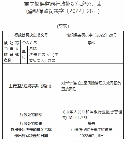 李荻對新華信托全面風(fēng)險管理失效問題負直接責(zé)任。依據(jù)《中華人民共和國銀行業(yè)監(jiān)督管理法》第四十八條,中國銀保監(jiān)會重慶監(jiān)管局對其警告。