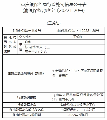 王愛紅對新華信托“三查”嚴(yán)重不盡職問題負主要責(zé)任。依據(jù)《中華人民共和國銀行業(yè)監(jiān)督管理法》第四十八條,中國銀保監(jiān)會重慶監(jiān)管局對其禁止終身從事銀行業(yè)工作。