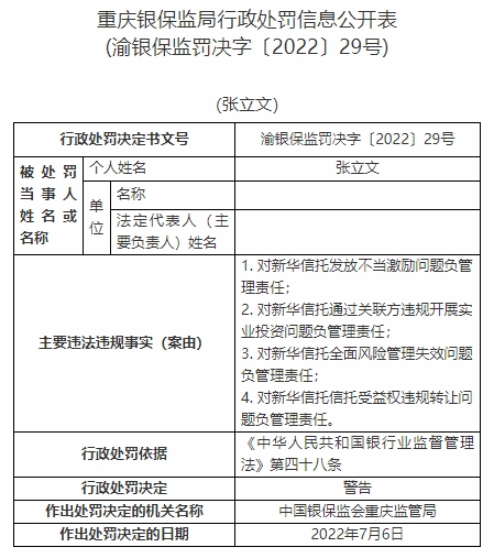 張立文對新華信托發(fā)放不當(dāng)激勵問題負管理責(zé)任、對新華信托通過關(guān)聯(lián)方違規(guī)開展實業(yè)投資問題負管理責(zé)任、對新華信托全面風(fēng)險管理失效問題負管理責(zé)任、對新華信托信托受益權(quán)違規(guī)轉(zhuǎn)讓問題負管理責(zé)任。依據(jù)《中華人民共和國銀行業(yè)監(jiān)督管理法》第四十八條,中國銀保監(jiān)會重慶監(jiān)管局對其警告。