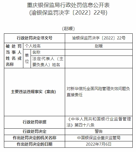 趙暖對新華信托全面風(fēng)險管理失效問題負直接責(zé)任。依據(jù)《中華人民共和國銀行業(yè)監(jiān)督管理法》第四十八條,中國銀保監(jiān)會重慶監(jiān)管局對其警告。