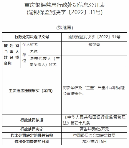 張繼青對新華信托“三查”嚴(yán)重不盡職問題負直接責(zé)任。依據(jù)《中華人民共和國銀行業(yè)監(jiān)督管理法》第四十八條,中國銀保監(jiān)會重慶監(jiān)管局對其警告并罰款5萬元。