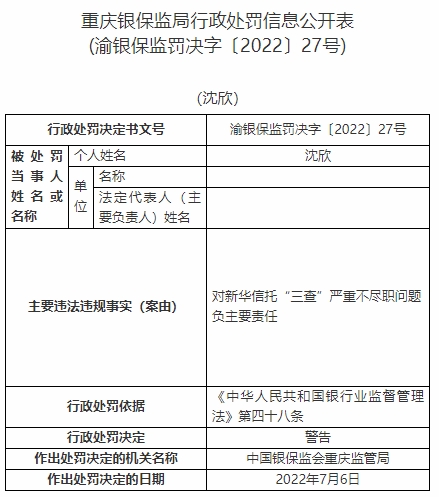 沈欣對新華信托“三查”嚴(yán)重不盡職問題負主要責(zé)任。依據(jù)《中華人民共和國銀行業(yè)監(jiān)督管理法》第四十八條,中國銀保監(jiān)會重慶監(jiān)管局對其警告。