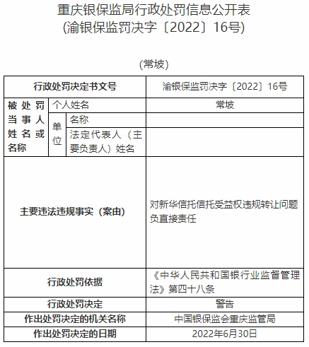常坡對新華信托信托受益權(quán)違規(guī)轉(zhuǎn)讓問題負直接責(zé)任。依據(jù)《中華人民共和國銀行業(yè)監(jiān)督管理法》第四十八條,中國銀保監(jiān)會重慶監(jiān)管局對其警告。
