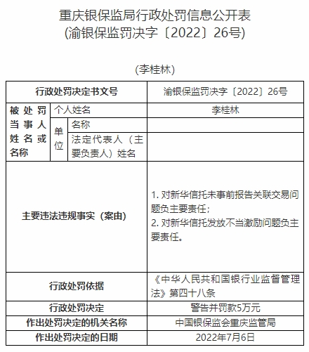 李桂林對新華信托未事前報告關(guān)聯(lián)交易問題負主要責(zé)任、對新華信托發(fā)放不當(dāng)激勵問題負主要責(zé)任。依據(jù)《中華人民共和國銀行業(yè)監(jiān)督管理法》第四十八條,中國銀保監(jiān)會重慶監(jiān)管局對其警告并罰款5萬元。