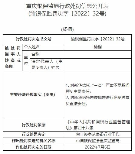 楊桐對新華信托“三查”嚴(yán)重不盡職問題負主要責(zé)任、對新華信托未按規(guī)定進行信息披露負直接責(zé)任。依據(jù)《中華人民共和國銀行業(yè)監(jiān)督管理法》第四十八條,中國銀保監(jiān)會重慶監(jiān)管局對其禁止終身從事銀行業(yè)工作。