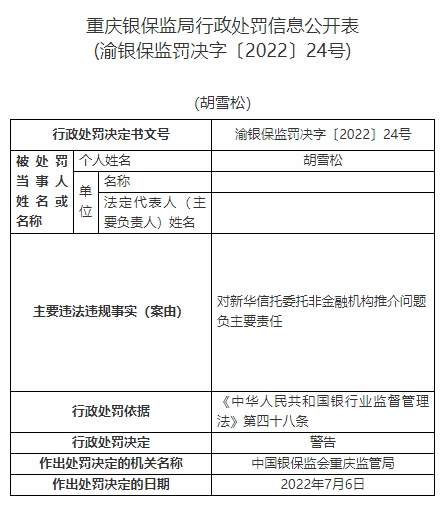 胡雪松對新華信托委托非金融機構(gòu)推介問題負主要責(zé)任。依據(jù)《中華人民共和國銀行業(yè)監(jiān)督管理法》第四十八條,中國銀保監(jiān)會重慶監(jiān)管局對其警告。