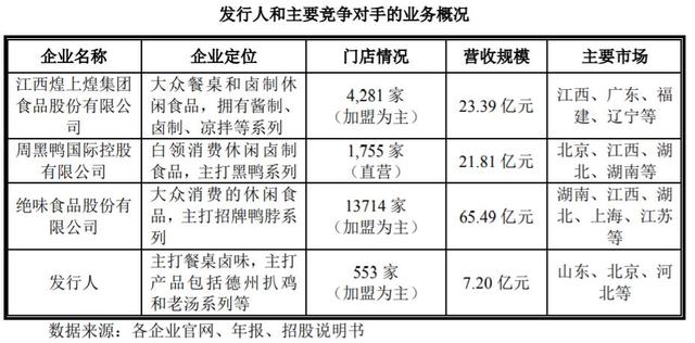 在招股書中,德州扒雞將休閑鹵制品企業(yè)煌上煌、周黑鴨、絕味食品列為行業(yè)內(nèi)主要競爭對手。需要注意的是,不論是營收規(guī)模還是門店數(shù)量,德州扒雞都遠不及這些競爭對手。