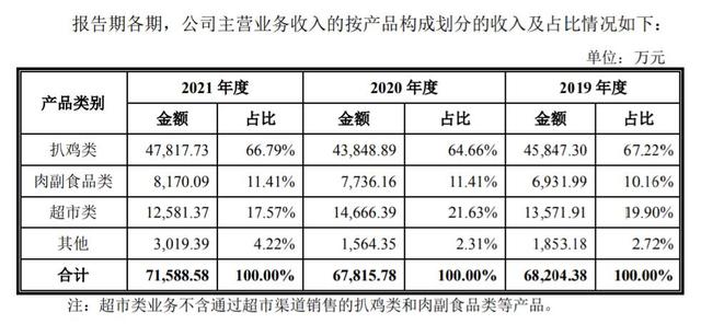 德州扒雞六成以上收入由扒雞貢獻。數(shù)據(jù)顯示,2019年至2021年,其扒雞類產(chǎn)品分別收入4.58億元、4.38億元、4.78億元,分別占主營業(yè)務(wù)收入的67.22%、64.66%、66.79%。