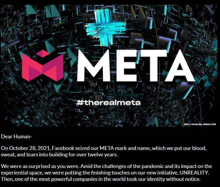 同時(shí),小Meta的CEO還發(fā)表博客文章控訴道:“2021年10月28日,F(xiàn)acebook獲得了我們的META標(biāo)志和名稱,這是我們十二年來用自己的血、汗和眼淚建立起來的。我們和你們一樣驚訝……世界上最強(qiáng)大的公司之一在未告知的情況下奪走了我們的身份?!?/p>