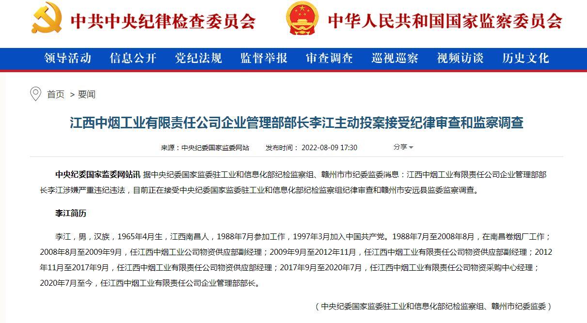 另據(jù)中央紀委國家監(jiān)委駐工業(yè)和信息化部紀檢監(jiān)察組、贛州市市紀委監(jiān)委消息:江西中煙工業(yè)有限責任公司企業(yè)管理部部長李江涉嫌嚴重違紀違法,目前正在接受中央紀委國家監(jiān)委駐工業(yè)和信息化部紀檢監(jiān)察組紀律審查和贛州市安遠縣監(jiān)委監(jiān)察調(diào)查。