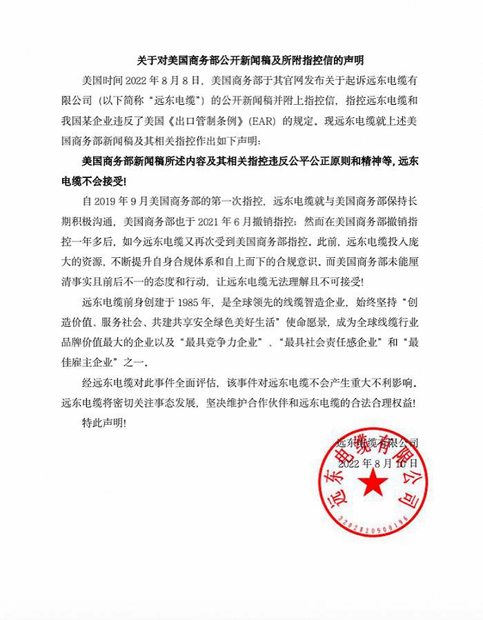 8月11日消息,遠(yuǎn)東電纜有限公司發(fā)布關(guān)于對(duì)美國商務(wù)部公開新聞稿及所附指控信的聲明稱,美國商務(wù)部新聞稿所述內(nèi)容及其相關(guān)指控違反公平公正原則和精神等,遠(yuǎn)東電纜不會(huì)接受。