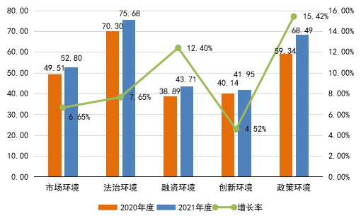 從五個一級指標來看,各參評城市市場環(huán)境、法治環(huán)境、融資環(huán)境、創(chuàng)新環(huán)境和政策環(huán)境整體均有所改善,得分均值分別為52.80、75.68、43.71、41.95和68.49,分別比上次評估增長6.65%、7.65%、12.40%、4.52%和15.42%。
